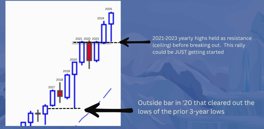 Part 4 – S&P 500 Yearly Candles –  The S&P 500 yearly chart is showing 2 very interesting candlestick patterns that may point to significantly higher prices.