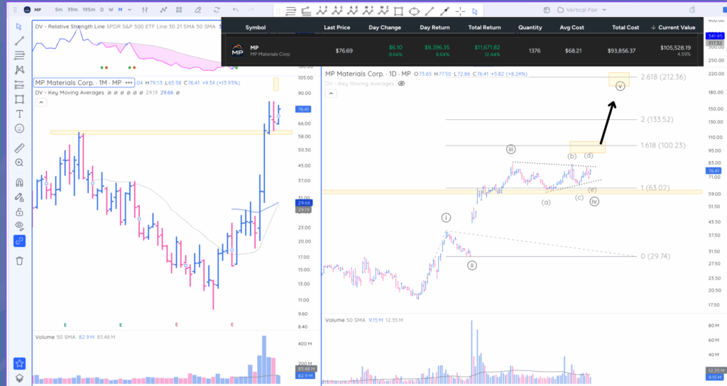 Part 6 – New Position in MP Materials – Chinese Restricting Exports! Rare earth mineral stocks are ripping following news that Chinese is going to restrict exports of rare earth miners.  Elliott wave triangle-4 forming, here’s upside target.  And yes, we already hold the position in both Active Opps and Savvy Trader.